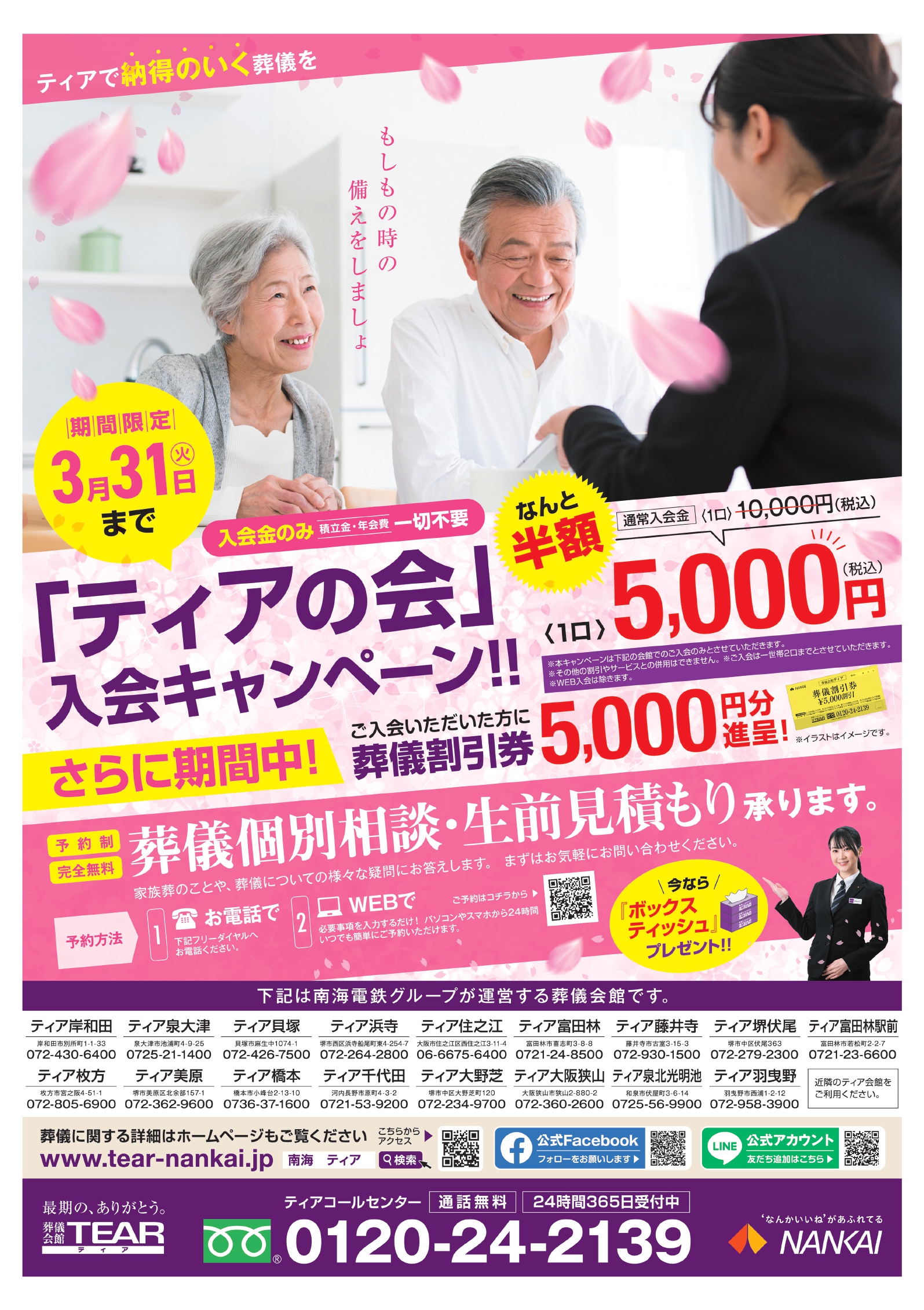葬儀費用が大変お得になる「ティアの会」入会キャンペーンを開催中です。