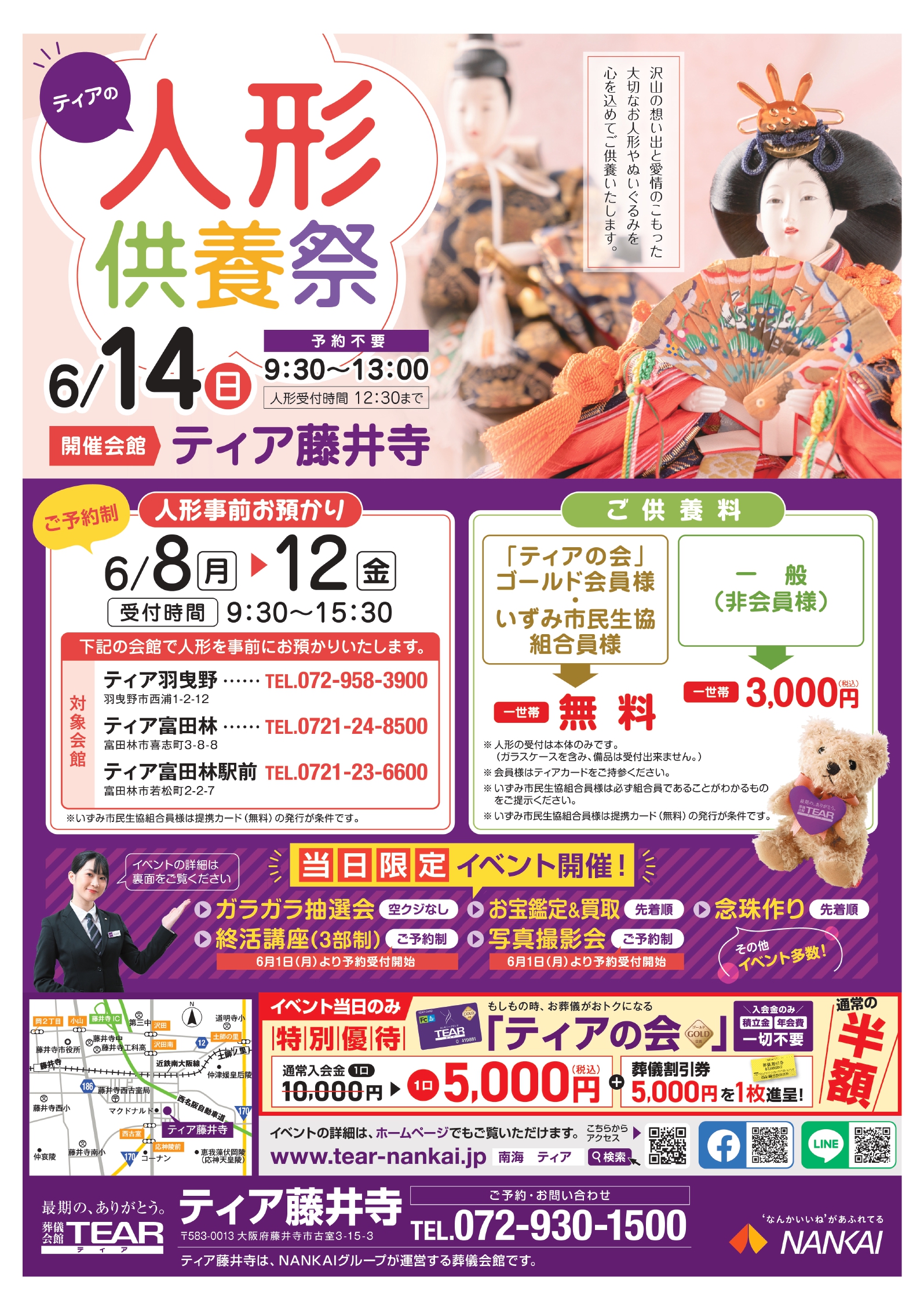 ※人形事前お預かりは、ティア羽曳野・ティア富田林・ティア富田林駅前で承ります。