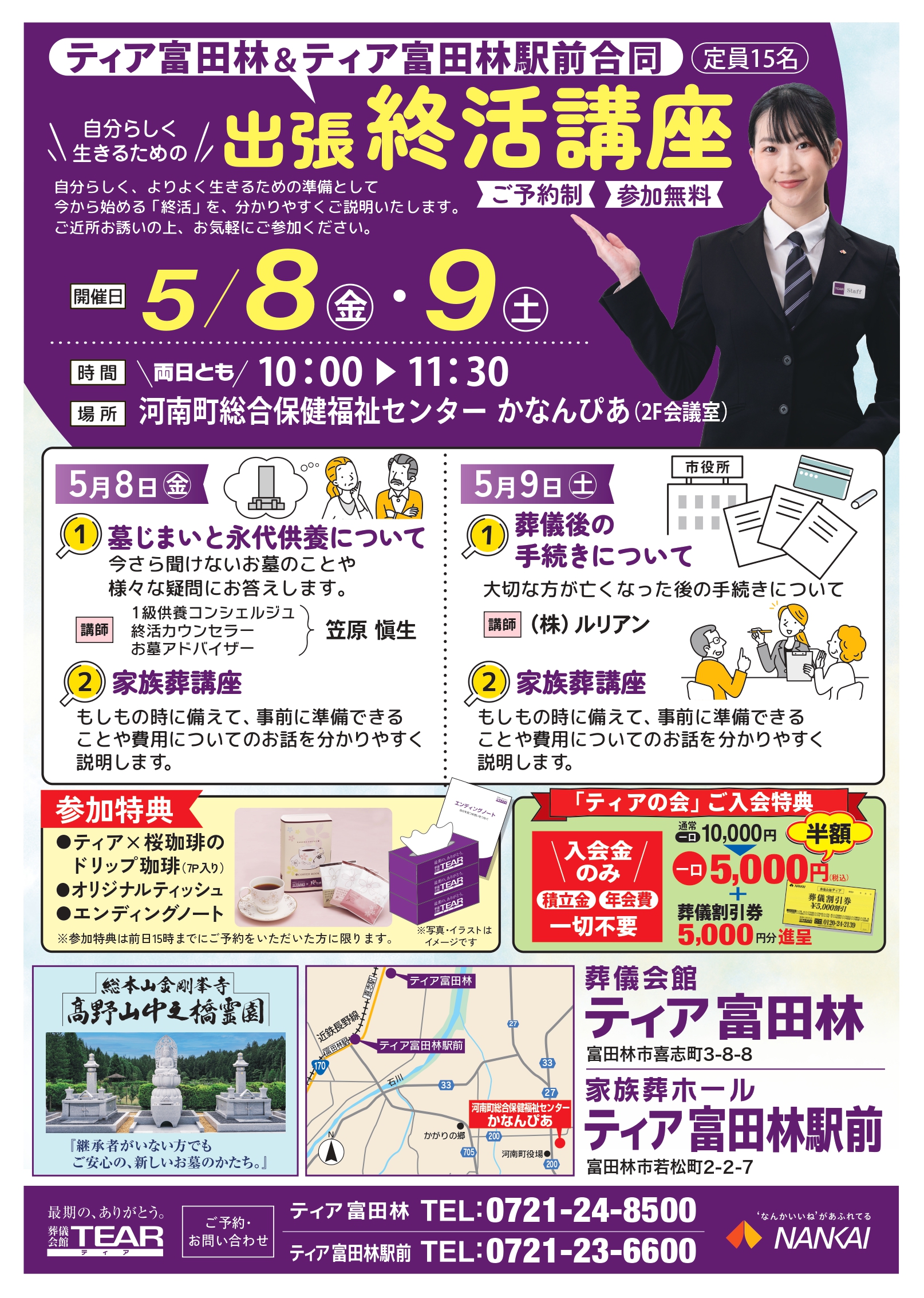 ティア富田林&ティア富田林駅前 出張終活講座 / 墓じまい・葬儀後の手続き&お葬式の流れと費用について